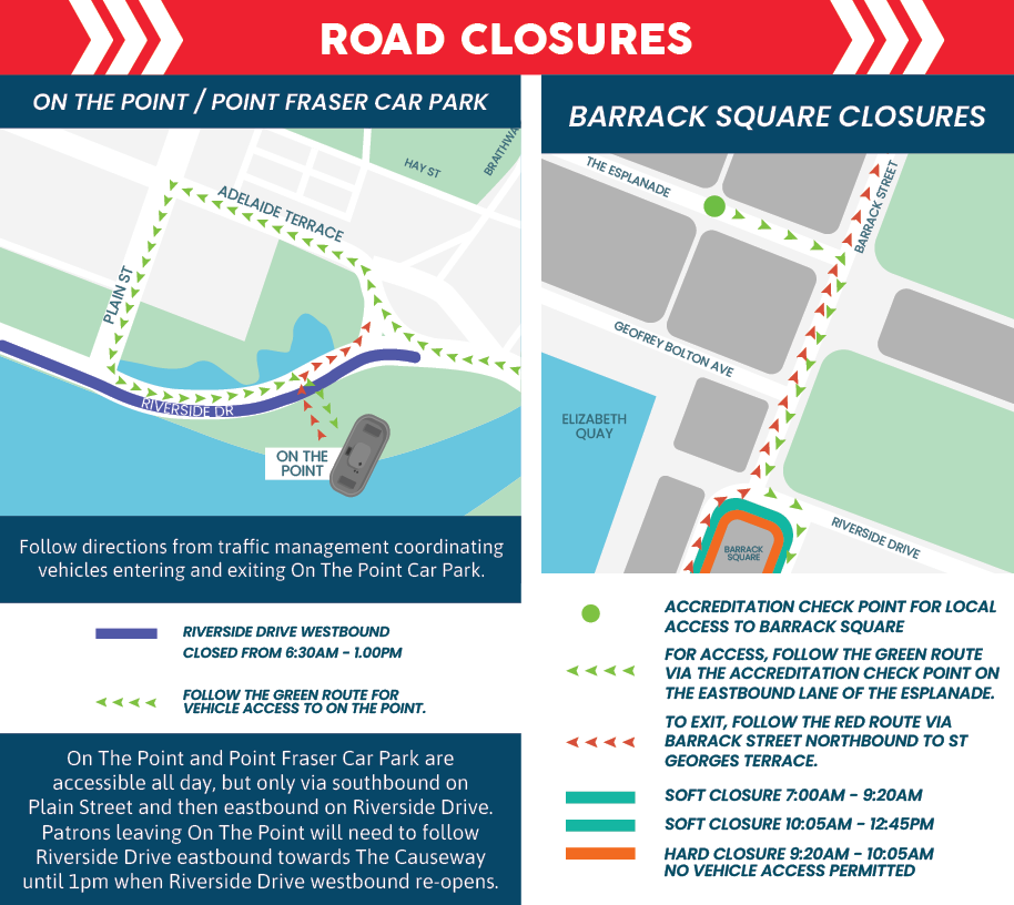 7:00AM | Barrack Square, soft closure from 7:00-9:20am. with a hard closure from 9:20am - 10:05am and a subsequent soft closure from 10:05am -12.45pm | 12:45PM |