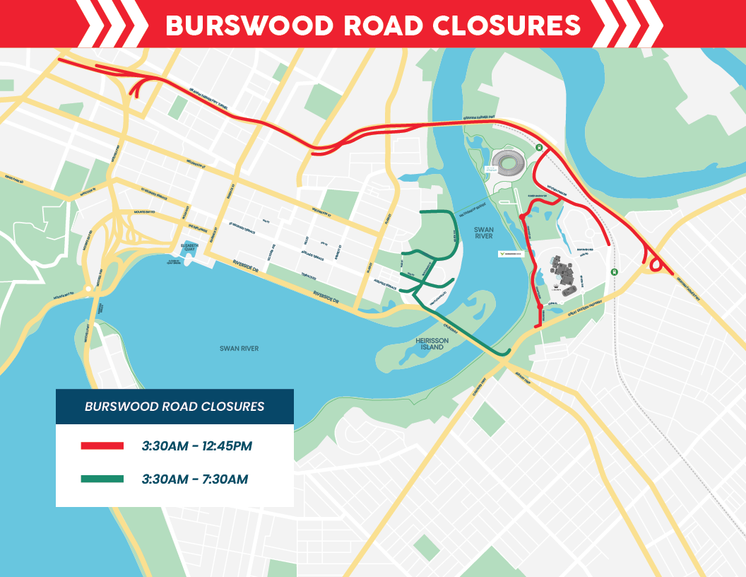 The below closures are in place around the Burswood Area. As soon as the last runner passes, access will be restored.